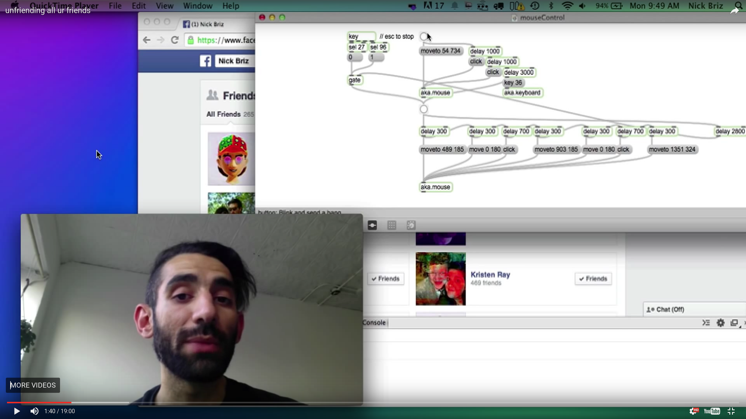 The emotional aspect of this project aside for an instant, I find the methodology developped in order to leave facebook very well woven. Specifically, the logging of the functions that the buttons of the facebook interface run, the reverse engineering, if you will, of all of the recipes that build the front end interface is a real example of how to interact with the opposites of seamlessness interfaces. Nick describes these scripts as brute force hacks, and by that he means that the exploits he has found in the un-engineering process are lightly to be different for different situations. But actually, I believe he uses the words ‘brute force’ and ‘hack’ to warn anybody that may be reproducing some of his steps that there is an unofficial and unstable nature to the processes. Essentially, this project uses knowledge of how website interfaces are built, to unbuild it. He runs the same methods, the same keys, the same functions that the site itself runs, but simply in an unexpected (from Facebooks side) order.